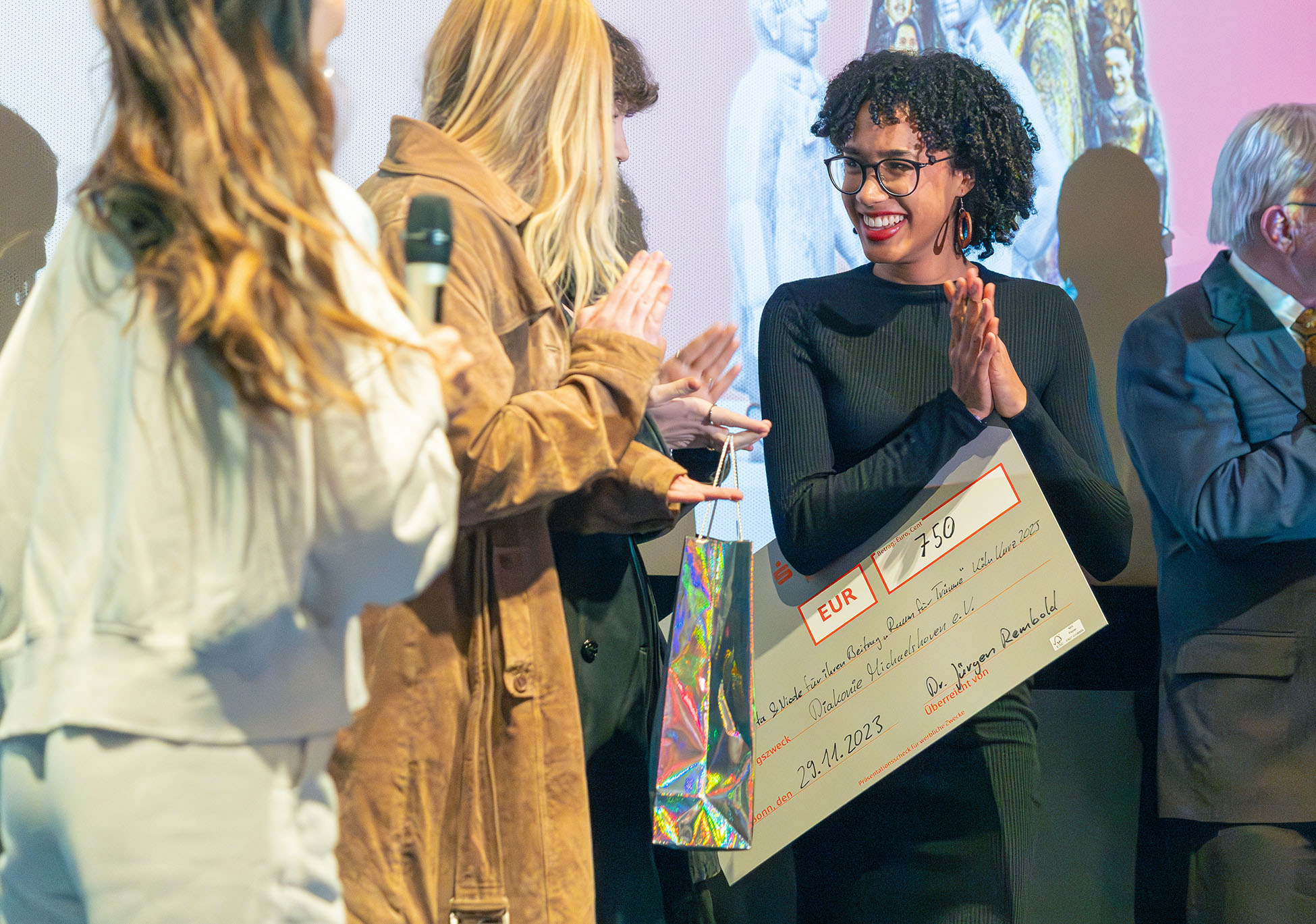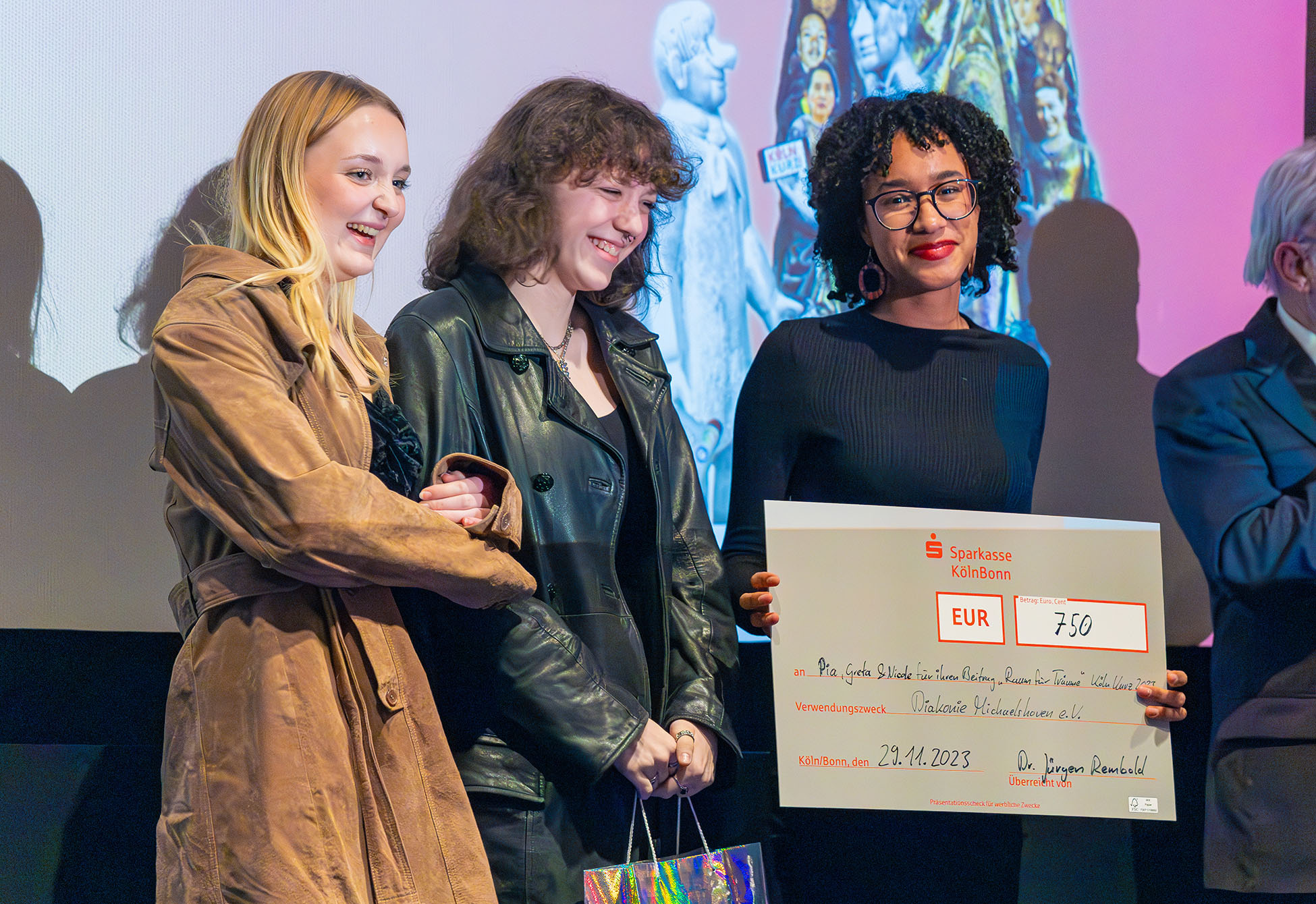 Der Beitrag „Raum für Träume“ von Nicole, Keta und Pia erreichte Platz 2 in der Alterskategorie „16+ Jahre“. „,Raum für Träume‘ überzeugt vor allem mit einem starken, gefühlvollen Text“, würdigte Laudatorin Lisa. Den gemeinnützigen Anteil dachten die drei Mädchen der Diakonie Michaelshoven zu. Den Scheck nahm Herbert Reitinger, Leiter der Kundenbetreuung bei der Diakonie Michaelshoven, in Empfang.