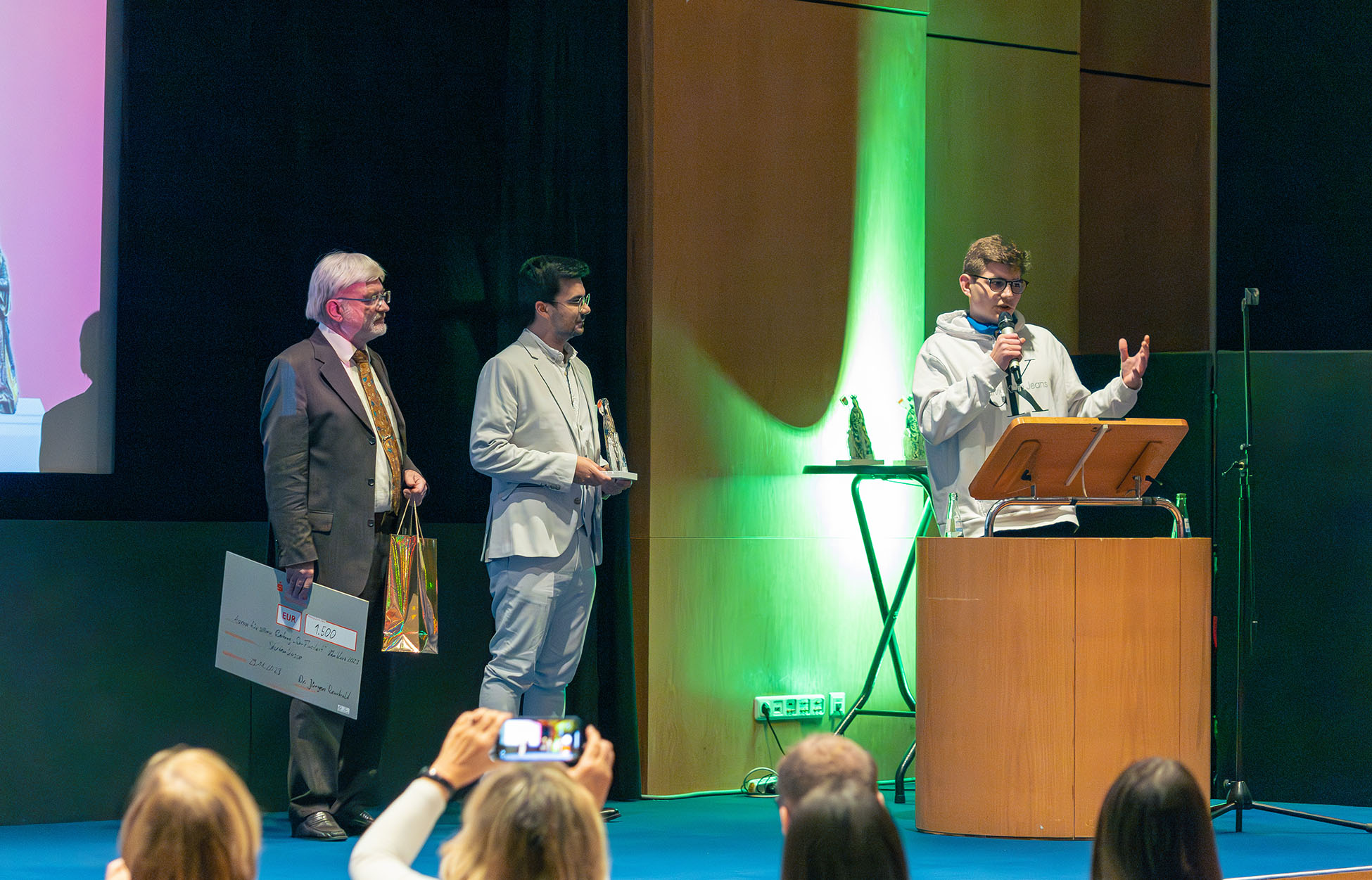 Ein Gewinner stand bereits vor dem Galaabend fest: Aaron hatte den Publikumspreis für sich entscheiden können. Sein Beitrag „Der Flusslauf“ sammelte bei YouTube und Facebook die meisten „Likes“. Er thematisierte hierin sehr offen und eindringlich das Thema Mobbing. Die Wichtigkeit eines offenen Umgangs mit diesem Thema betonte auch Laudator Üwen Ergün, Geschäftsführer des KRF KinderRechteForums. Als bundesweite Beratungsstelle bietet das KRF betroffenen Kinder und Jugendlichen wertvolle Hilfe.