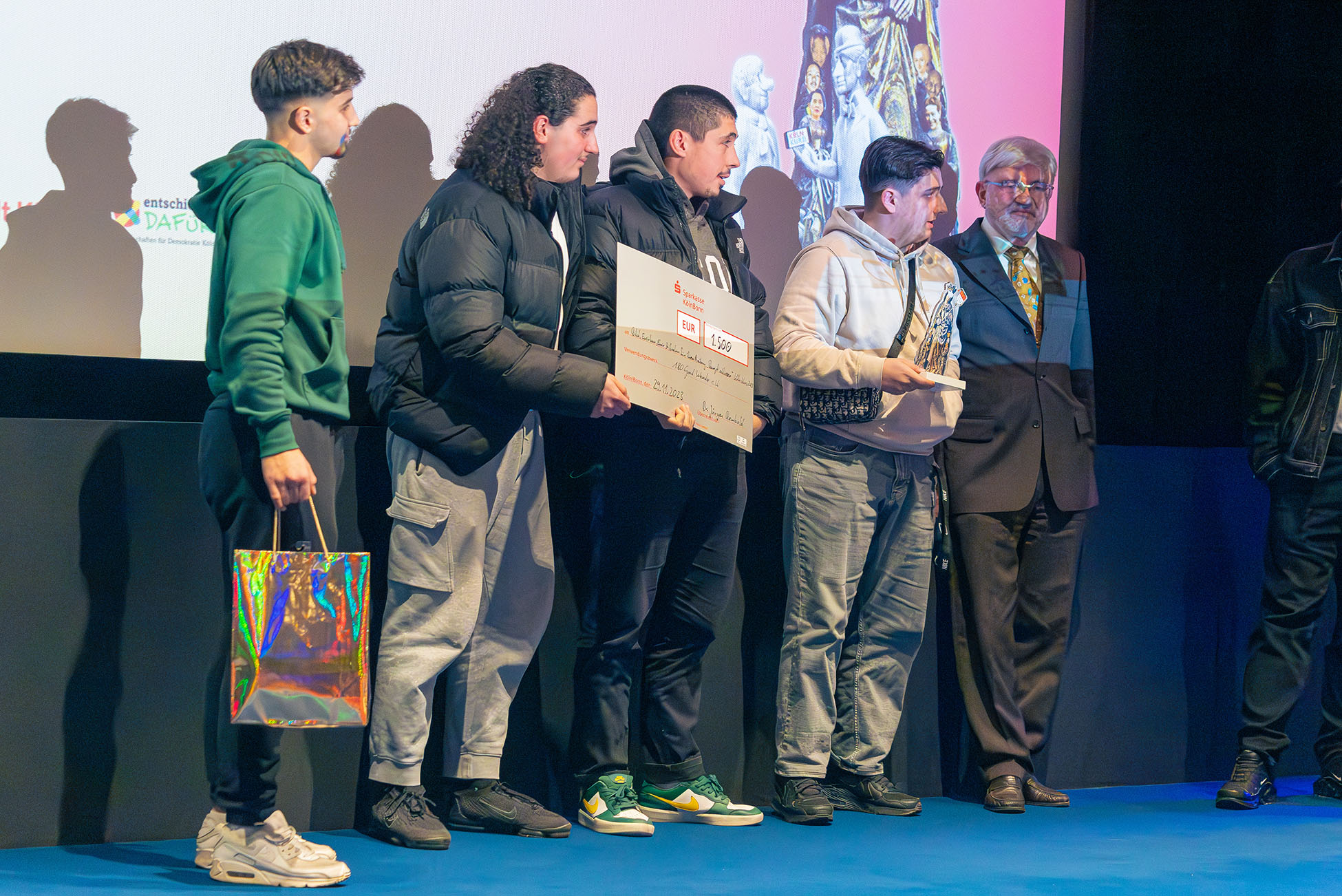 Anschließend standen die Auszeichnungen in der Alterskategorie „16+ Jahre“ an. Platz 1 holten sich Emirhan, Bilal, Emir und Ibrahim mit ihrem Beitrag „Dampf ablassen“. Die Ursel übergab Schauspielerin und Influencerin Lisa Küppers. „Euer Kurzfilm zeigt – einerseits mit ziemlich viel Humor, andererseits mit unterschwelligem Ernst – was Freiräume alles einschränken kann. Und warum es dann so wichtig ist, dass es sie gibt, wie zum Beispiel in einer Jugendeinrichtung“, sagte sie in ihrer Laudatio. Überhaupt zeigte sich Lisa hoch beeindruckt von allen Einreichungen des Abend: „Ich habe mit 13, 14 auch schon Filme gedreht – die waren aber längst nicht so gut wie die, die wir hier heute Abend gesehen haben.“ 1.000 Euro des Preisgelds der vier Jungs gehen an die Jugendeinrichtung 180Gradwende, die in ihrem Beitrag auch im Mittelpunkt steht.